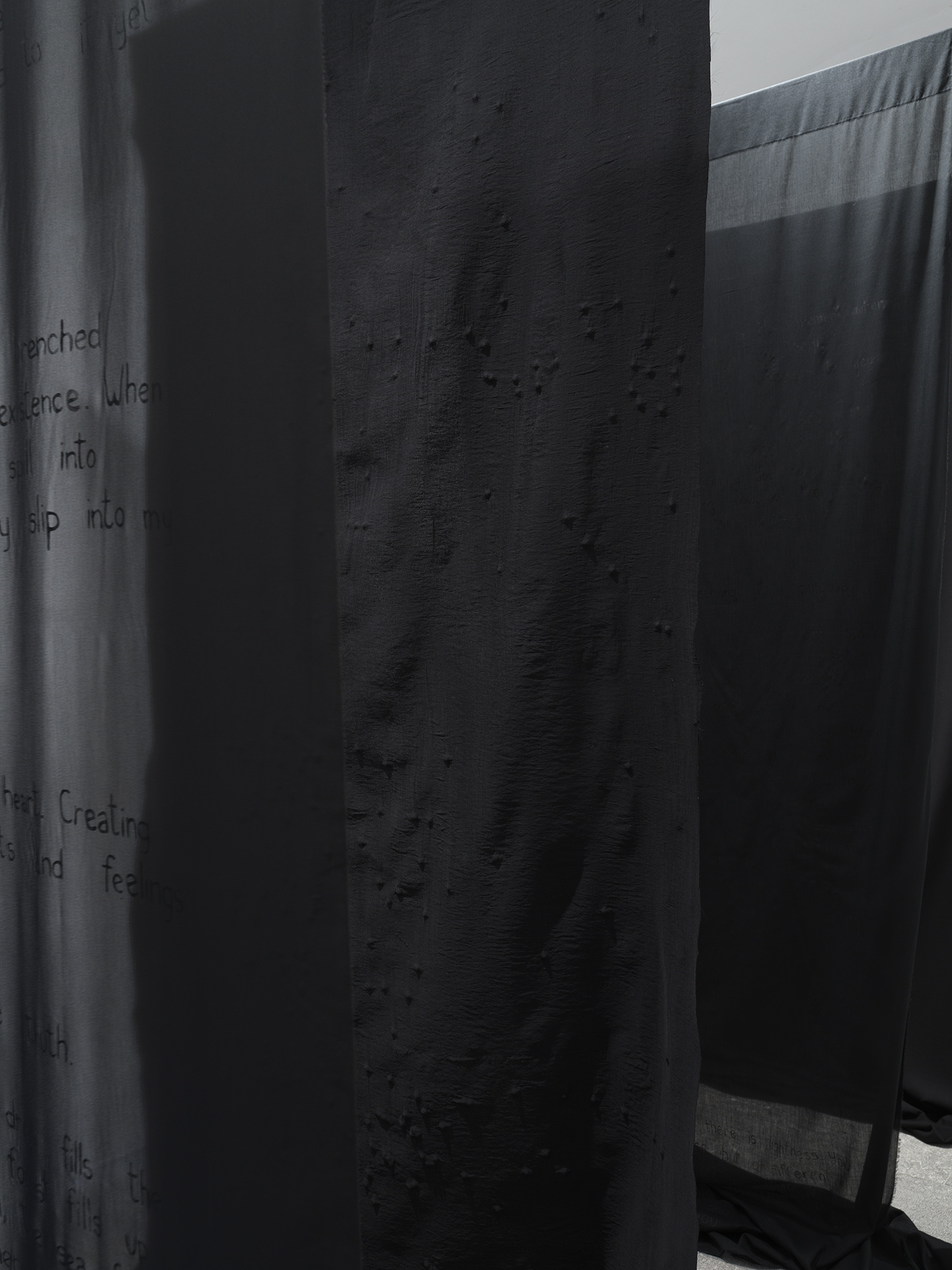 Nika Batista prek dovzetnega tekstila in delikatnih niti raziskuje občutljivost ter neprekinjen tok misli in čustev, ki so temelj njenega dela. Sposobnost tekstila, da prevzame obliko, odraža umetničino zanimanje za materializacijo občutkov. S svojo zgodovino pa nosi tudi njeno potrebo po povezovanju in razumevanju – drugih, sebe, trenutka in preteklosti.